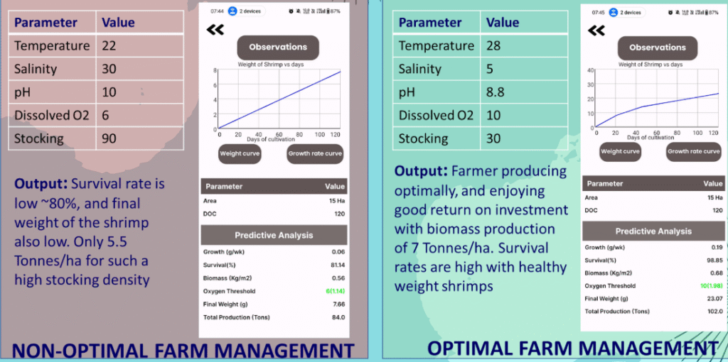 The APY (Area–Production–Yield) Analysis solution by Nirdhwani is a data-driven digital tool designed to improve shrimp and seaweed farming by systematically analysing farm area, production output, and yield efficiency. It integrates real-time and historical data to help farmers and stakeholders monitor performance, identify productivity gaps, optimize resource use, and support sustainable aquaculture practices, ultimately enabling informed decision-making and improved economic and environmental outcomes in the blue economy.